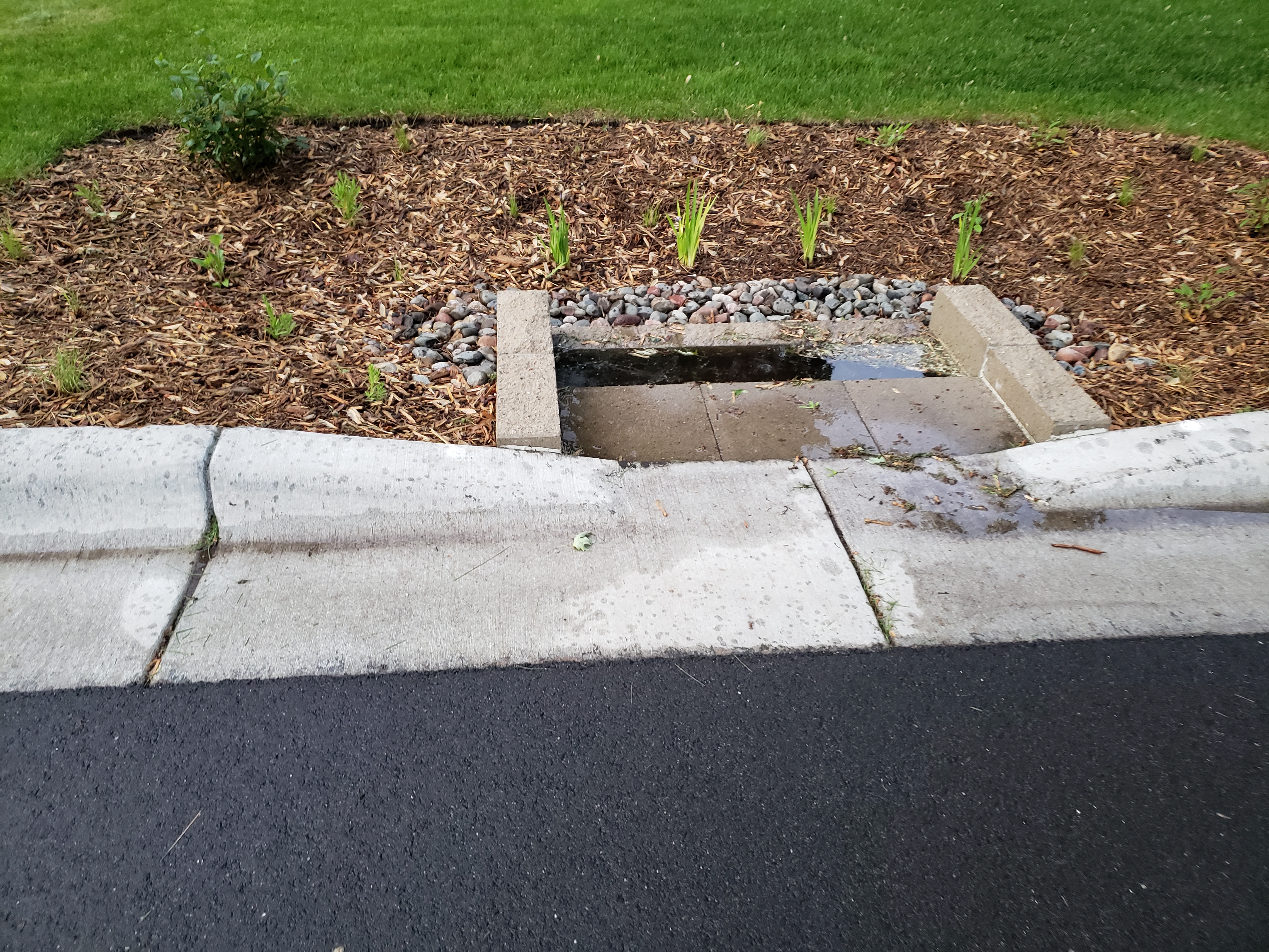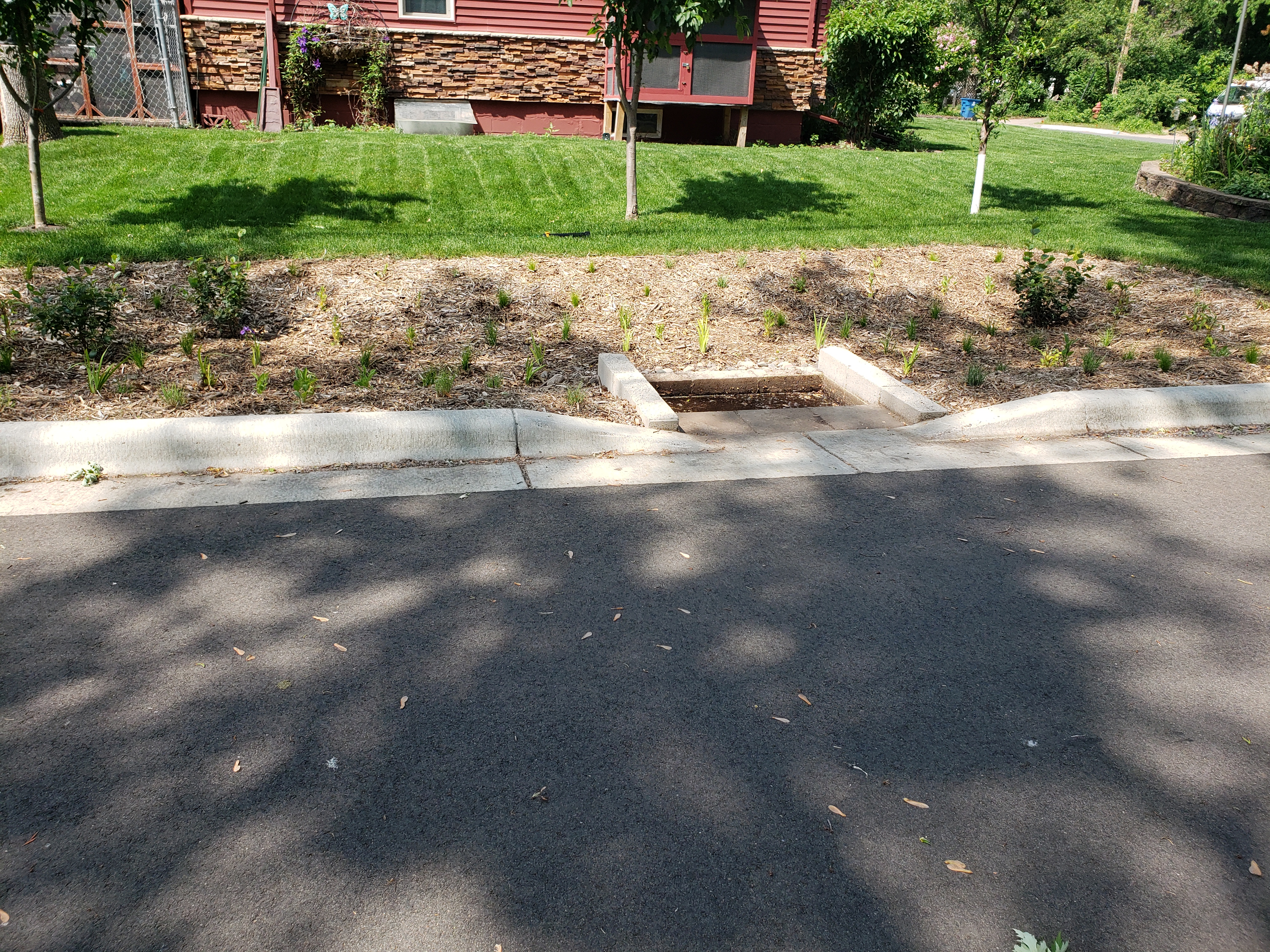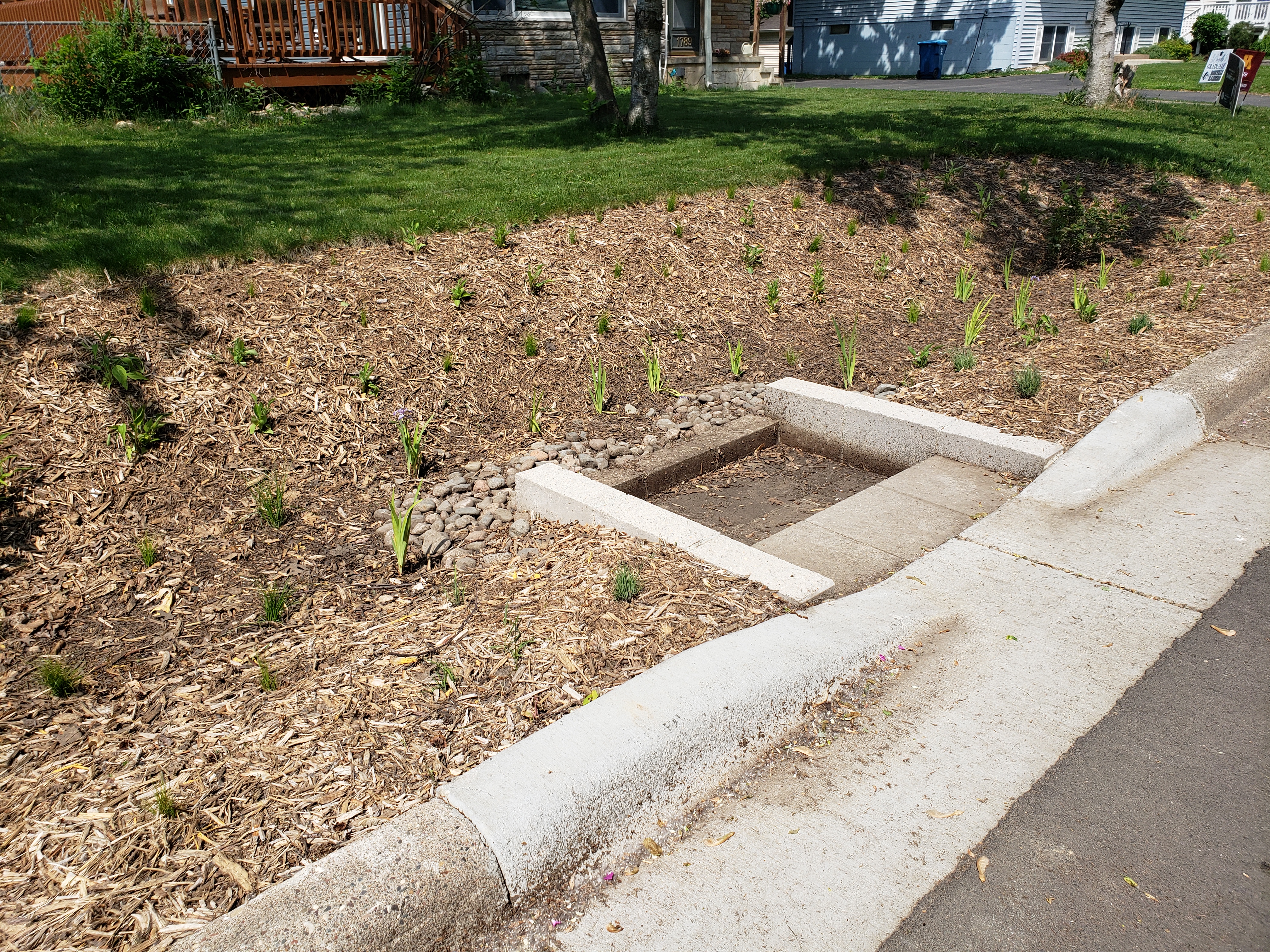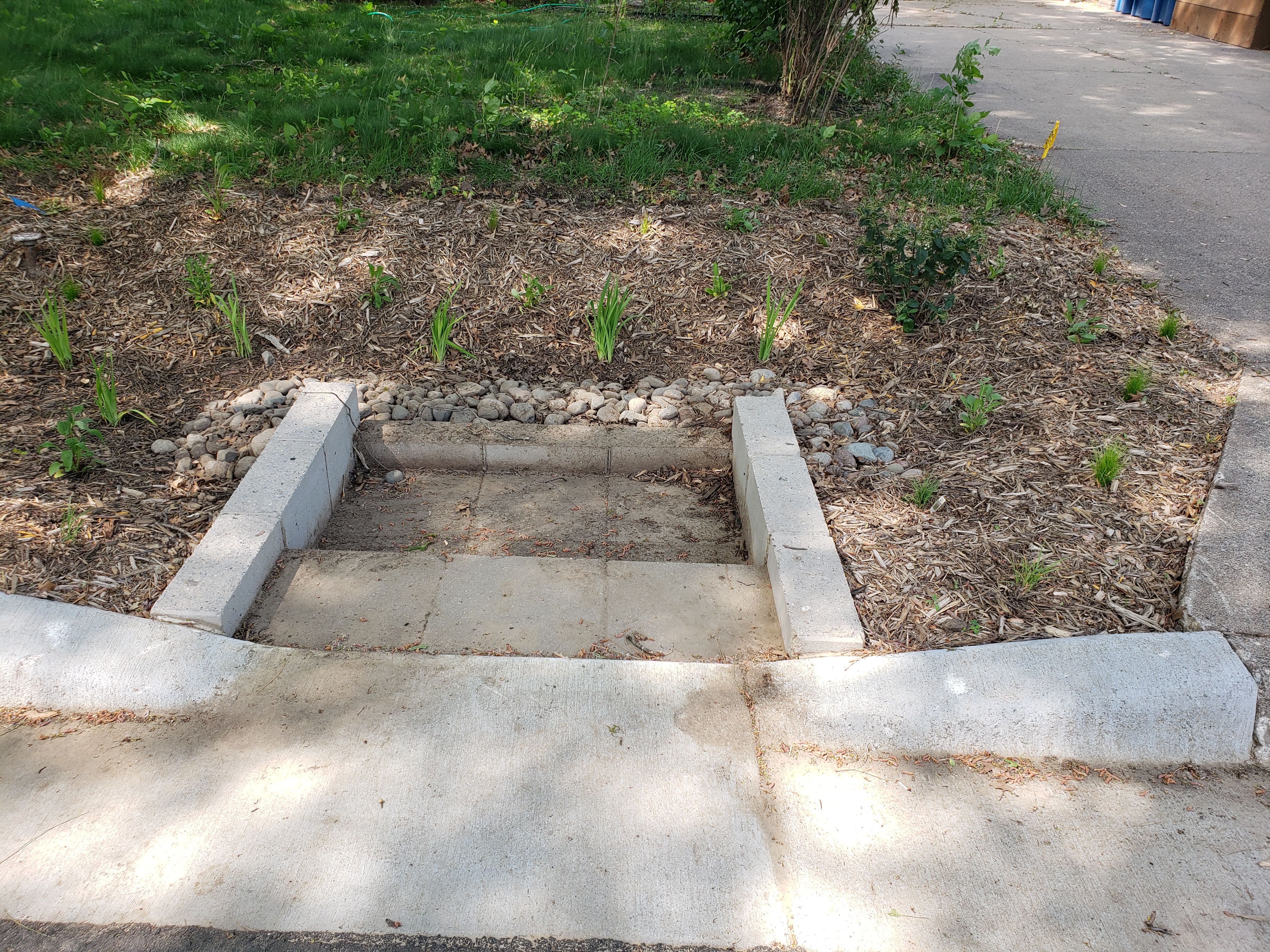 For this project, curb cut rain gardens were the selected stormwater treatment practice. Rain gardens are specially designed plantings with a bowl shape that allows them to capture and filter rainwater from surrounding hard surfaces. The curb cut feature – a break in the curb’s edge – guides water from the street into the garden. The rain gardens in this project also feature a concrete splash block and sump pretreatment structure that collects sediment and debris. From there, long-rooted native plants in the rain garden basins help filter pollutants from the collected stormwater as it soaks into the ground.