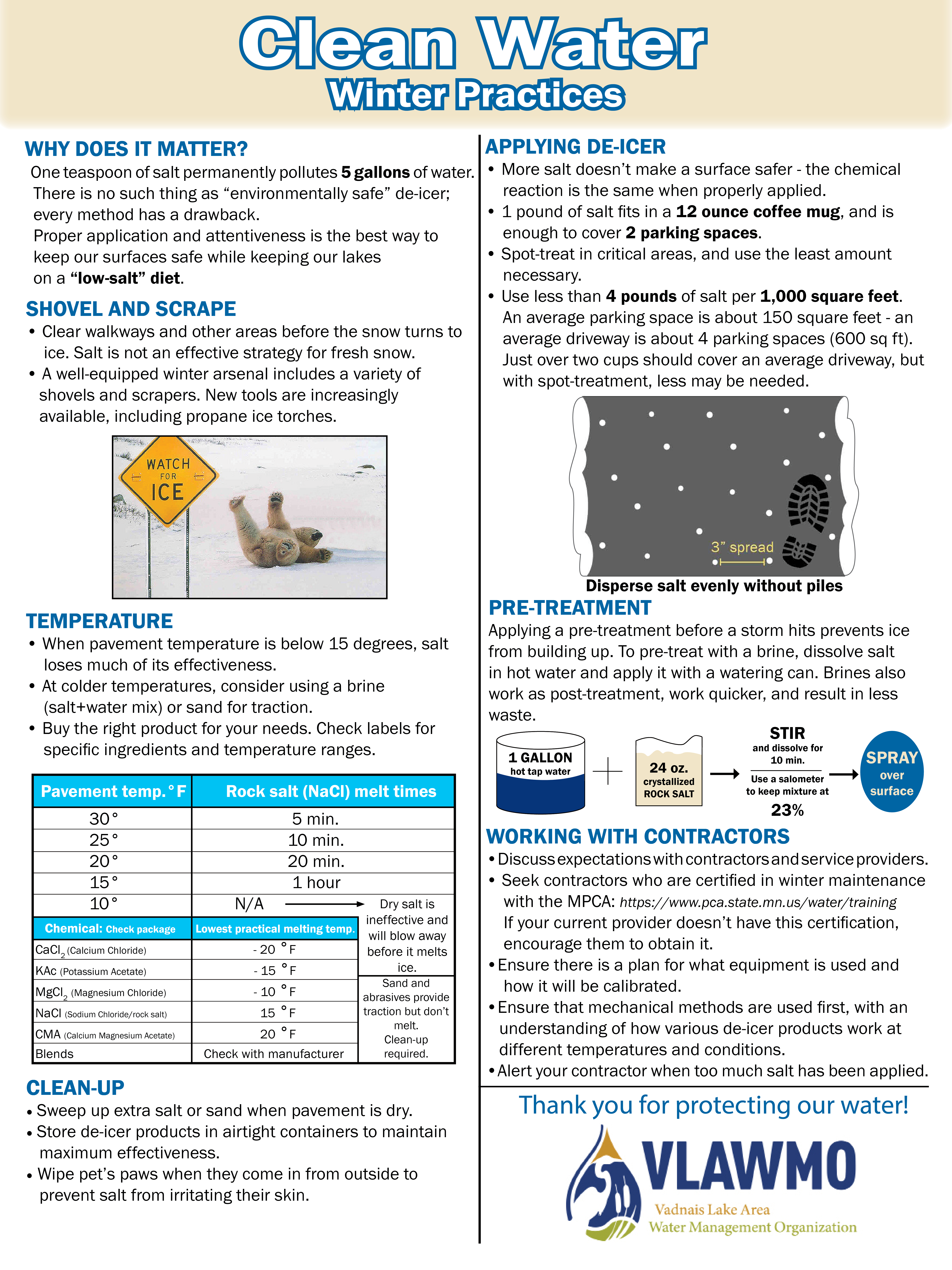 If you have a strong need for bare pavement due to safety concerns or community members having a high risk for falls, a brine strategy may be another option to apply salt strategically yet use less overall. Brines, or anti-icing, are applied before a winter storm, and prevent ice from bonding to the pavement from the start. Store a brine in a closed container for later use, but be careful to mix only as much as you'll need. Dispose of extras in a household drain and not on pavement. Avoid completely coating surfaces - just a light, dotted spray helps prevent ice from bonding. Many municipalities apply anti-icing stripes on roads with ~3" gaps between each line of brine, and this increases the effectiveness of physical removal.